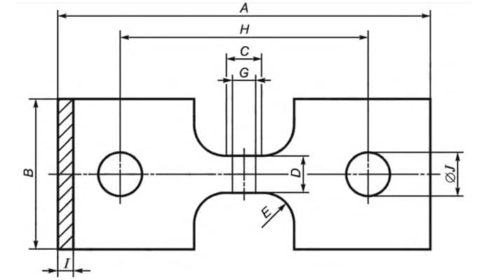 Si tratta di un classico provino ad “osso di cane”, che viene generalmente testato con degli appositi afferraggi, al posto delle classiche pinze con morsetti.